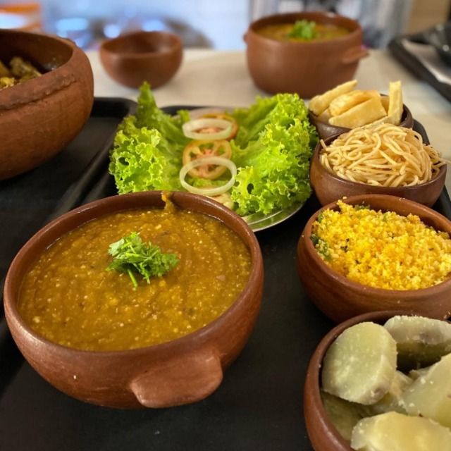 Galinha acompanhada de Arroz branco, Cuscuz e Macarrão.