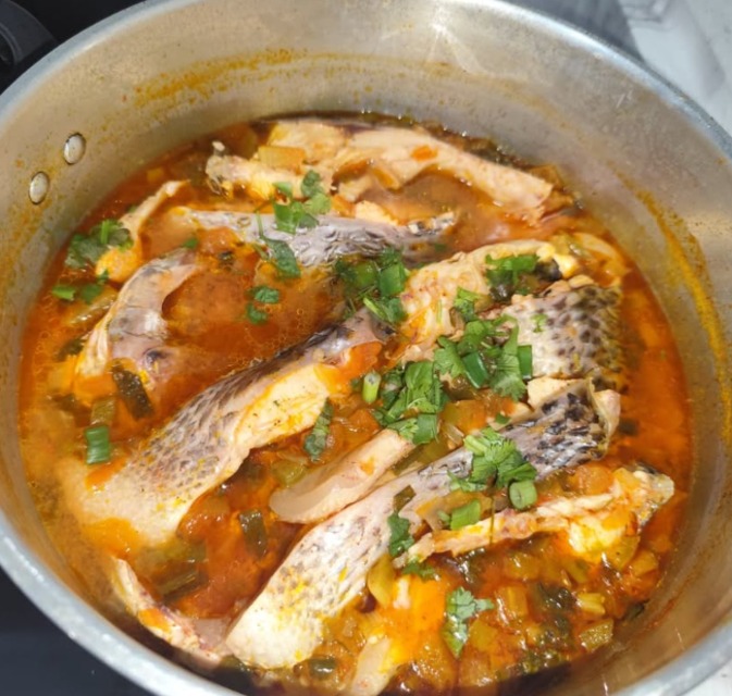 Peixe cozinhado com tempero da casa acompanhado de arroz e macarrão.